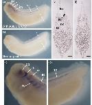 In situ hybridization of xNP1 transcripts in wound tail stumps of the ârefractoryâ period tadpoles after amputation. Whole mount in situ hybridization was performed using amputated tail stumps of the ârefractoryâ period tadpoles on (a and d) day 0, (b and e) days 3, and (c and f) days 11 after amputation, with (aâc) antisense or (dâf) sense DIG-labeled xNP1 probe. xNP1 expression in the amputated tail stumps on 3 days after amputation was also examined by section in situ hybridization using (h) antisense or (i) sense DIG-labeled xNP1 probes. We also performed in situ hybridization on 10, 24 and 48 h after amputation (iâq). (j and k), (m and n), (p and q) are magnified views of boxed areas in (i, l and o), respectively. The bars indicate (aâf) 1 mm and (g, h, i, l and o) 0.1 mm, respectively. The orientation of the specimen in each panel was the same as in Figure 3. Arrowheads in each panel indicate signals. ep, epidermis; me, mesenchyme; nc, notochord; sc, spinal cord. |