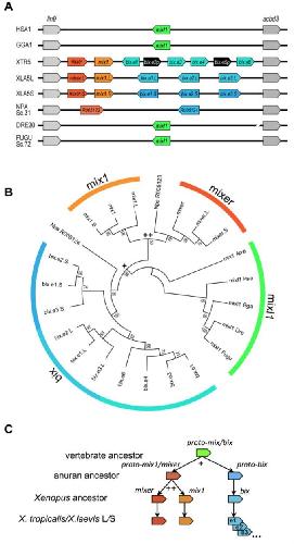 Genomic structure of Mix/Bix gene clusters and multi-to-multi orthologous relationships between bix genes in Xenopus. (A) Synteny of the mix/mixer/bix gene clusters. Human (Homo sapiens; HSA1), chicken (Gallus gallus; GGA3), X. tropicalis (XTR5), X. laevis (XLA5L and XLA5S), Tibetan frog (Nanorana parkeri; NPA scaffold31), pufferfish (Trafugu rubrpies; FUGU scaffold72), and zebrafish (Danio rerio; DRE20) chromosomes are indicated. Black gene symbols represent pseudogenes. (B) Phylogenetic analysis of mix/bix family genes. Maximum likelihood methods were performed with 1,000 bootstrap pseudoreplicates. The parameter model was estimated with MEGA6 ( Tamura et al., 2013), using JTT model. Nodes of + and ++ are prospective first and second tandem duplications of ancestral mix genes, respectively. (C) A hypothesis for the generation of mix/bix gene cluster. A single mix/bix ancestral gene in the vertebrate ancestor was duplicated into proto-mix1/mixer and proto-bix genes in the anuran ancestor (indicted as +; see also B), followed by duplication of the proto-mix1/mixer to mix1 and mixer genes in the Xenopus ancestor (++). Further, the gene expansion and subsequent gene conversion of the bix gene took place in each species and/or subgenome. |
