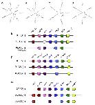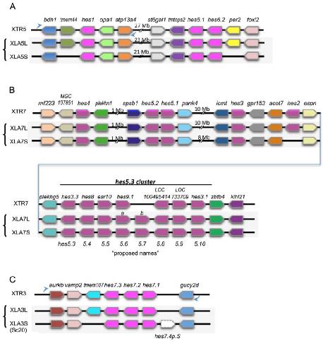 Syntenic analysis of hes genes between X. laevis and X. tropicalis. (A) Synteny around hes1 and hes6 loci. (B) Synteny around hes2, hes4, hes5, and the hes5.3 cluster loci. (C) Synteny around the hes7 locus. Species and chromosome numbers are as indicated: XTR, X. tropicalis; XLA, X. laevis. Sc indicates scaffold. Pentagon arrows show genes with the 5â² to 3â² direction. Curved blue arrows indicate flipping of genome sequences to align gene orders. A broken-lined pentagon arrow indicates a pseudogene. |