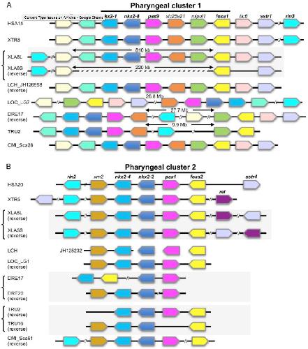 Comparison of pharyngeal gene clusters in vertebrate genomes. (A) Comparison of pharyngeal cluster 1, which includes transcription factors, nkx2-1, nkx2-8, pax9, and foxa1. In the X. laevis genome, genes from mbip.S to mipol1.S are deleted, but foxa1.S is retained in XLA8S. In actinopterygian genomes, genes from mbip to slc25A21 are retained as a cluster, but genes from mipol to sstr1 are located in a distant genomic region. Teleost genomes only possess one cluster, possibly due to deletion of the duplicated cluster after whole genome duplication. (B) Comparisons of pharyngeal cluster 2, which consists of transcription factors, nkx2-4, nkx2-2, pax1, and foxa2. In the X. laevis genome, duplicated clusters are completely conserved in both XLA5L and 5S. In the coelacanth genome, nkx2-2, pax1, and foxa2 are separated into scaffolds, JH130518, JH128098, and JH128726, respectively, one gene per scaffold. In teleost genomes, duplicated clusters are partially conserved after the teleost-specific, whole-genome duplication. Syntenic gene homologs with foxa genes are indicated with bold letters. HSA, Homo sapiens; XTR, Xenopus tropicalis; XLA, Xenopus laevis; LCH, Latimeria chalumnae (coelacanth); LOC, Lepisosteus oculatus (spotted gar); DRE, Danio rerio (zebrafish); TRU, Takifugu rubripes (fugu); CMI, Callorhinchus milii (elephant shark). |