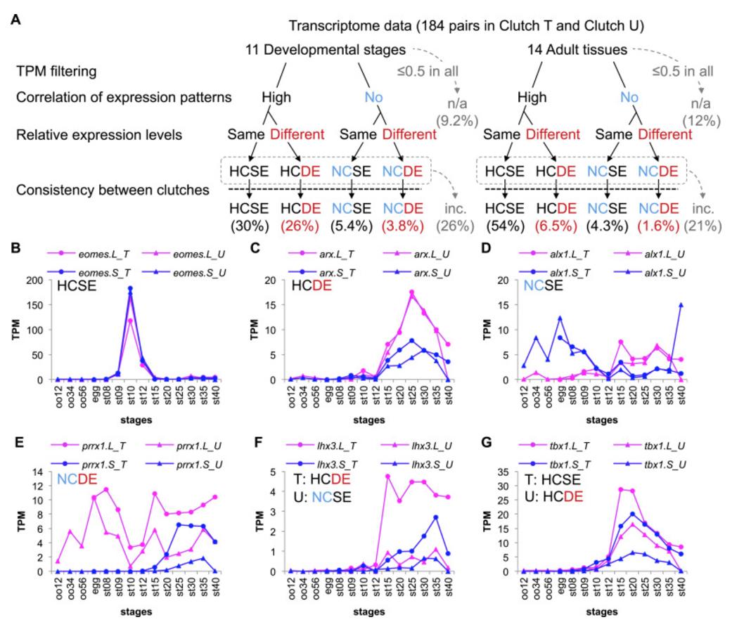 Overview of transcriptome correlation analysis. (A) Workflow of the transcriptome correlation analysis. See Section 2 for details. Homeolog pairs with inconsistent results between clutches are labelled "inc". (B-E) Examples of four groups. The group name is presented in each graph. In the case of inconsistent group names in different clutches, names are presented separately. (B) eomes.L and eomes.S (HCSE), showed quite similar expression patterns. (C) arx.L (HCDE), showed stronger expression than arx.S throughout developmental stages (st15-35). (D) alx1.L and alx1.S (NCSE) showed different expression patterns. (E) prrx1.L (NCDE) showed stronger expression than prrx1.S and their expression patterns are quite different throughout developmental stages. (F, G) Examples of inconsistent categories between clutches. (F) lhx3 in Clutch T (HCDE) had stronger expression of lhx3.L than lhx3.S. However, lhx3 was categorized as NCSE in Clutch U with very low expression levels of homeologs. (G) tbx1 in Clutch U (HCDE) showed stronger expression of tbx1.L than tbx1.S at st15-35. However, tbx1 was categorized as HCSE in Clutch T with similar expression levels of homeologs at st25-35. Line graphs show expression levels of genes during oogenesis and embryogenesis. Magenta, L genes; Blue, S genes; circles, Clutch T; triangles, Clutch U. |