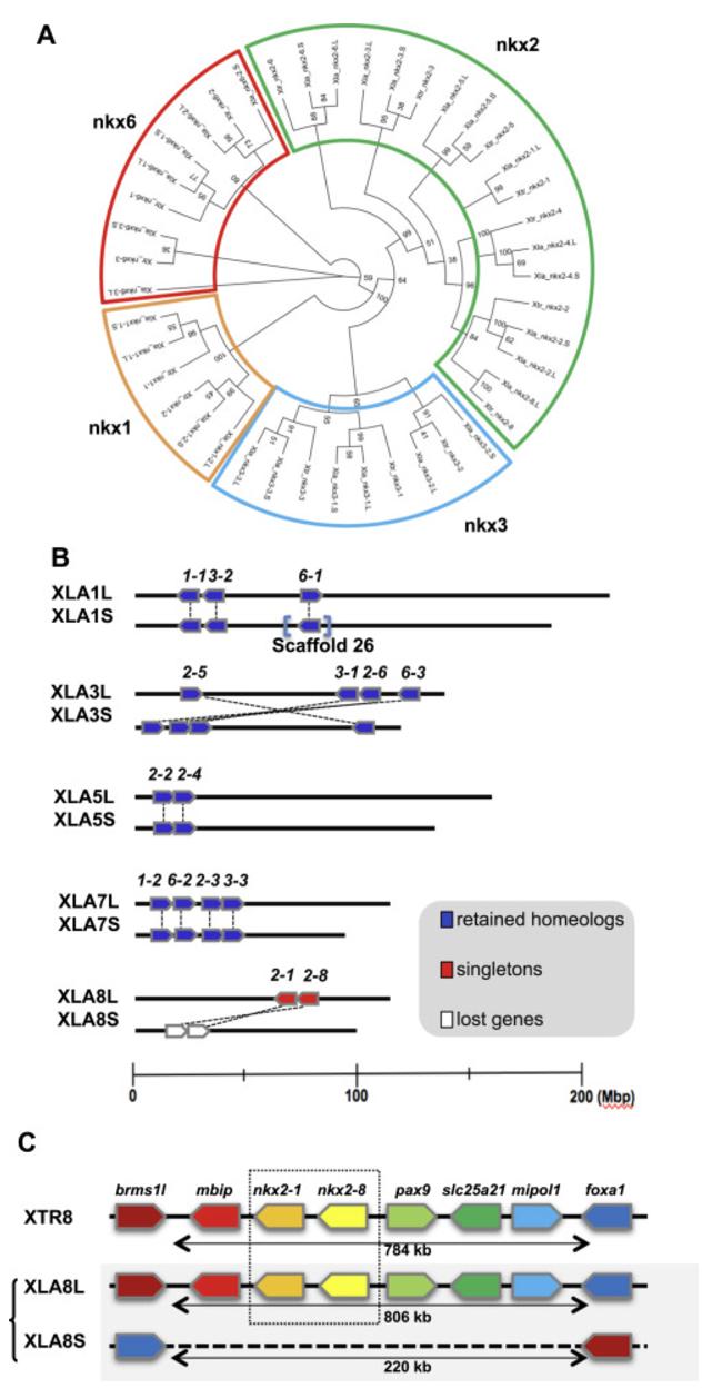 Identification and syntenic analysis of Nkx family genes. (A) Using a Xenopus genome browser search, we identified 15 nkx genes from X. tropicalis and 28 from X. laevis. Phylogenetic analysis of deduced amino acid sequences indicates that Xenopus nkx genes belong to four classes. (B) nkx genes of the X. laevis genome retain their homeolog pairs, except nkx2-1.L and nkx2-8.L. Homeologs of these genes are missing, probably due to chromosomal deletion. (C) Schematic representation of chromosomal deletion found in XLA8S including nkx2-1and 2-1 genes. Genes surrounding the deleted region of X. tropicalis (XTR8) and X. laevis (XLA8L and XLA8S) are shown.