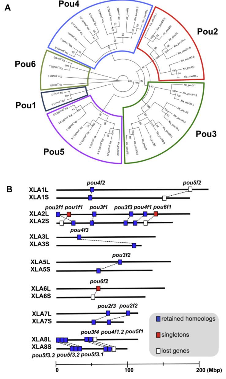 Identification and syntenic analysis of POU family genes. (A) Phylogenetic analysis of predicted amino acid sequences from 31 genes that encode POU domain proteins. Xtr, X. tropicalis, Xla, X. laevis. As in mammals, POU family genes of X. laevis could be grouped into 6 classes according to sequence similarities. (B) Location of homeologous gene pairs on X. laevis chromosomes. In almost all POU classes, both homeologs were identified (blue box). Gene loss of one homeolog was found in several homeologous gene pairs (white box), leaving singletons (red box). Orthologs of mammalian pou5f1 and pou5f2 were not found in the corresponding position (white box).