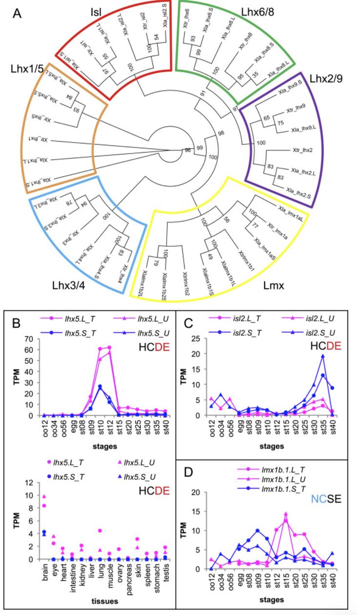 Identification and transcriptomic analysis of Lhx family genes. (A) Phylogenetic tree of Lhx family genes of Xenopus. Xtr, X. tropicalis, Xla, X. laevis. Bootstrap support values for nodes are indicated (n=100). Subfamilies were supported at 100 values and orthologs were supported at 93â100 values, except for lhx2 (83) and lhx9 (65). Transcriptomic data of lhx5 (B), isl2 (C), and lmx1b.1 (D) are shown in graphs similar to those in Fig. 1. See text for detailed explanations of variable expression profiles. |
