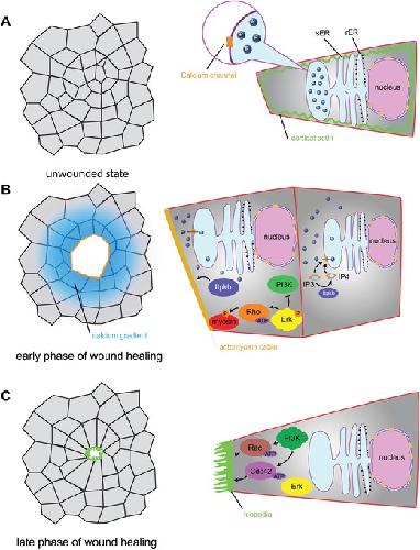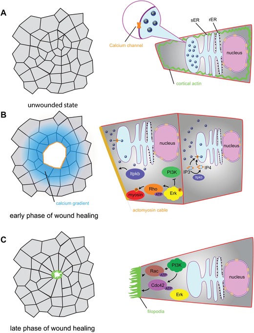 Figure 2. Stages of multicellular wound healing. (A) In an unwounded epithelium, calcium ions are stored in the network of smooth endoplasmic reticulum (ER) and cell shape is maintained by cortical actin. Blue beads, calcium ions. (B) At early stages post wounding, calcium ions are released from the ER storage through calcium channels. The opening of the calcium channels is promoted by both IP3 and the product of Itpkb, IP4. The wave of calcium release propagates planarly across several rows of epithelial cells, mobilizing a larger region of the epithelial sheet for reepithelialization. On the other hand, cortical actin in leading edge cells undergoes reorganization and forms a contractile actomyosin cable at the wound edge. Itpkb regulates the accumulation of Fâactin, whereas Erk signaling regulates myosinâ2 activation, mediated by active RhoA. PI3K activity is inhibited at this stage. (C) Closure of the wound at a later stage is driven by filopodial zippering at the leading edge. PI3K signaling is active, and through Rac and Cdc42 transforms earlyâstage actomyosin cable to filopodial protrusions |