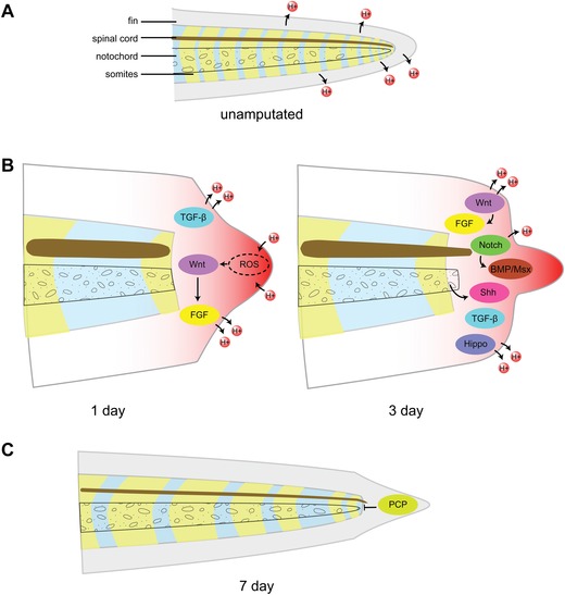 Figure 3. Stages of tadpole tail regeneration. (A) A Xenopus tadpole tail is composed of a number of axial structures including the spinal cord, notochord, and somites. An unamputated tail is in a polarized state, sustained by VâATPase pumps in the skin. (B) After amputation, wounded tail is depolarized and simultaneously reactive oxygen species (ROS) are produced at the amputation site. Downstream targets of the ROS include Wnt and FGF, and a number of other signaling pathways are required for successful regeneration such as Shh, TGFâβ, BMP, Notch, and Hippo pathways. VâATPases are also upregulated at this stage to repolarize the skin. (C) A fully functional tail is regenerated 7 days after amputation. The growth and termination of a regenerating tail are regulated by PCP signaling. BMP, bone morphogenetic protein; FGF, fibroblast growth factor; TGFâβ, transforming growth factor β; PCP, planar cell polarity |
