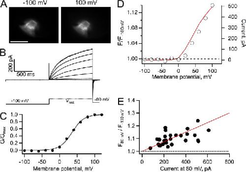 Figure 3. Patch-clamp fluorometry of Venus-Hv1 at pHi 7. (A) Fluorescence images of an inside-out patch held at the indicated membrane potential. Bars, 10 µm. (B) Proton currents from the patch in A elicited by depolarizing voltage-clamp pulses, as indicated by the schematic protocol. (C) Conductance versus voltage curve derived from the currents in B. The continuous line is a fit to Eq. 2 with parameters qa = 1.62 eo and V0.5 = 33.6 mV. (D) Fluorescence measured from the whole patch area at each voltage was normalized to the fluorescence at −100 mV. A ratio equal to one at all voltages indicates the absence of dequenching of the fluorescence of Venus. The red continuous line is the I-V curve from the currents in B. The bath solution contained 10 mM HEPES buffer. |