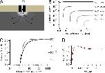 Figure 7. Diffusion model calculations. (A) Schematic representation of the proton depletion zone generated by an outward proton current through an Hv1 channel. (B) Calculations using Eq. 5 of the extent of the depletion of protons as a function of the radial coordinate, r, for different values of the bulk proton concentration, c∞, as indicated; the value of q = 14 fA is the same for all curves as well as DH = 7,000 µm2/s. (C) Calculation of the effect of the presence of buffer. The black curve was calculated with DH = 7,000 µm2/s and Eq. 5. The effect of the presence of buffer is illustrated by the dotted line, which was calculated with Eq. 6. The values of the constants are c∞ = 3.16 µM, [B] = 100 mM, a = 1 nm, kb = 1010 M−1s−1, and DH = 7,000 µm2/s. Data are presented as molar proton concentration (left axis) and corresponding pH (right axis). (D) Experimental (red) and simulated (black) currents in response to a 100-mV depolarization. Simulated current trace was generated taking into account a pH change during current development of 1 pH unit, which changes the single-channel current from 5 fA to 1.4 fA. The current is given by Eq. 7 in the form I(H,t)=N·(1−e−t/τ)[5−(5−1.4)(1−e−t/τ)], with τ = 200 ms and N as an arbitrary whole number chosen to match the size of the experimental current. |