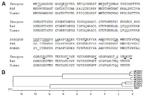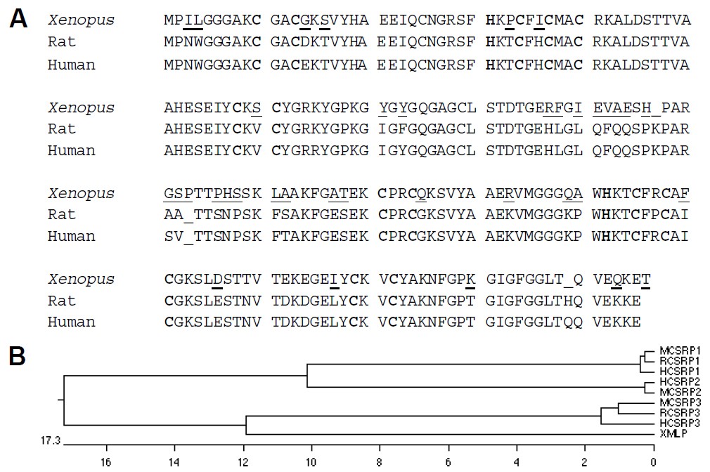 Fig. 1.Sequence analysis of Xenopus MLP. (A) A comparison of the Xenopus, rat, and human MLP amino acid sequences (GenBank accession numbers AAF78241, X81193 and AAA92571 respectively). Differences in the Xenopus MLP sequence, when compared to the mammalian sequences, are underlined. The cysteine/histidine residues that form the two zinc fingers are in bold and are conserved across all three sequences. (B) A dendrogram showing the relationship of XMLP to other members of the CRP family showing that the Xenopus sequence clusters with other vertebrate CRP3 sequences rather than CRP1 or CRP2.
