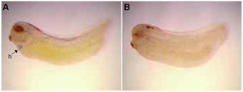 Fig. 3. MLP expression is disrupted by retinoic acid. Expression of MLP in (A) a normal heart (h, arrow) and (B) an embryo treated with 1 μM retinoic acid. Treatment with retinoic acid results in a complete loss of MLP expression in the heart region.