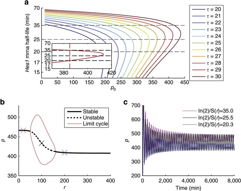 Figure 2. Presence of oscillations in the model when miR-9 acts only to affect the stability of Hes1 mRNA.(a) Different combinations of τ, p0 and S(r) are used to test for the presence of oscillations. The different coloured lines denote Hopf bifurcations for different values of τ as indicated. A Hopf bifurcation denotes the transition of a system from a stable to an unstable, oscillatory state or vice versa, as a parameter of the system is varied. Fixed points exist to the right of the curves whereas oscillations are present to the left. The inset shows the curve for τ=29. The dashed red line indicates the value of p0 for which two Hopf bifurcations exist for mRNA half-lives of ~35 and 20 min. (b) A window of oscillations emerges for changes in r, with p0 fixed at 390 and τ=29 min. (c) Example time series when r is fixed to the values given by crosses in (b). These r values give rise to the half-lives (ln(2)/S(r)) as indicated. n0=5, μp=22 min, bl=ln(2)/20 min−1, bu=ln(2)/35 min−1, r0=100, m0=5. |