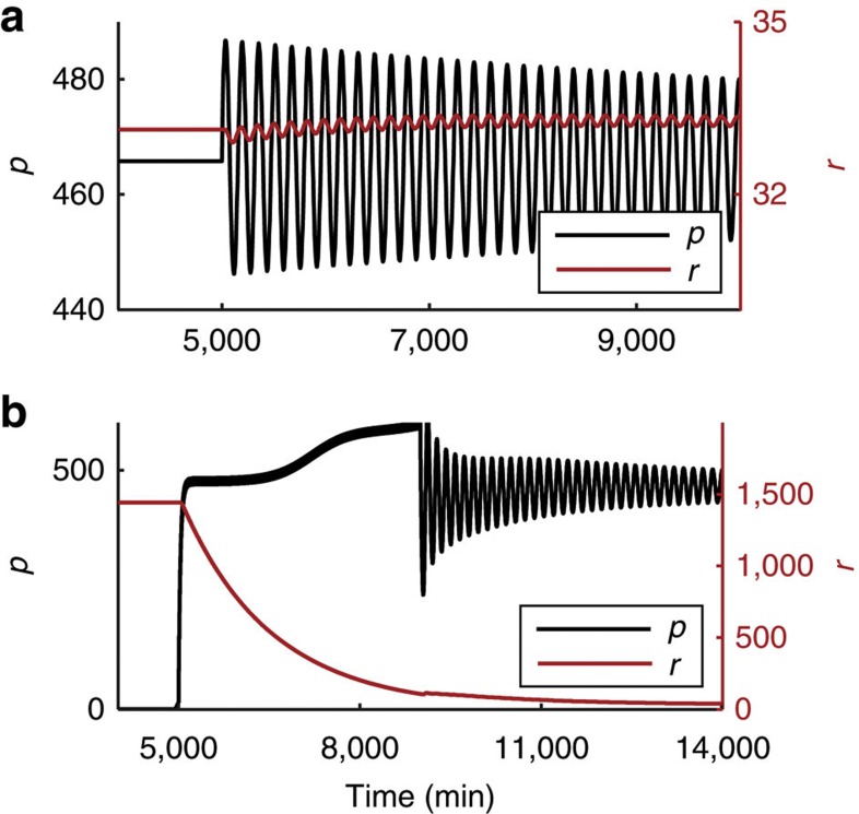 Figure 5. The high Hes1 steady state can be readily excited into transient oscillations.(a) The model is initiated in the high Hes1 state in a bistable regime (parameters as default and p1=220, initial conditions m=14.6766, p=465.8128, r=33.1285). At 5,000 min, the Hes1 mRNA levels are instantaneously set to a value 10% higher than at this steady state (that is, m=16.1433). The system is excited into transient oscillations. (b) The model is initiated in the low Hes1 steady state (initial conditions m=28.9, p=0.4, r=1442.6). To excite the system, at t=5,000 min, a perturbation of 15 units of protein (an initial 30-fold increase) is added every minute for 4,000 min. Other parameters are p0=390, τ=29 min, bl=ln(2)/20 min−1, bu=ln(2)/35 min−1, n0=n1=m0=m1=5, r0=100, r1=300, μp=22 min, μr=1,000 min. |