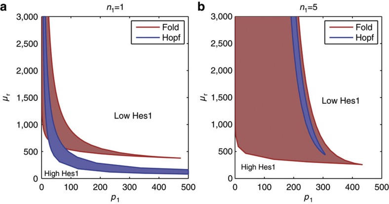 Figure 7. The model can display bistability, sustained oscillations, stable high or low levels of Hes1 depending upon its parameterization.Local bifurcations are shown for changes in the miR-9 degradation rate, μr, the strength of repression of miR-9 production by Hes1, p1 and the shape of repression of miR-9 production by Hes1, n1. The presence of Hopf and fold bifurcations are indicated by blue and red solid lines, respectively. Fold bifurcations lead to the creation or elimination of a pair of fixed points. Blue regions, therefore, indicate the presence of oscillations, while red regions indicate bistability. White regions represent the case of a single steady state with either high or low Hes1 levels (as indicated by the annotation). (a) n1=1. (b) n1=5. Other parameters are p0=390, τ=29 min, bl=ln(2)/20 min−1, bu=ln(2)/35 min−1, n0=m0=m1=5, r0=100, r1=300, μp=22 min. |