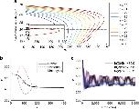 Figure 4. Oscillations and different steady-state levels of Hes1 in the full system for changes in the strength of repression of miR-9 by Hes1 (p1).(a) Shows a bifurcation diagram for changes in p1, with protein levels (p) given as output on the y axis. The circled area shows a magnified region of parameter space that contains oscillations (limit cycle maxima and minima given by red lines). (b,c) Show example of time series for a case of bistability (p1=272). The initial conditions (giving a constant history vector) are (b) m(0)=0, p(0)=0, r(0)=240 and (c) m(0)=0, p(0)=0, r(0)=100. Other parameters are p0=390, τ=29 min, bl=ln(2)/20 min−1, bu=ln(2)/35 min−1, n0=n1=m0=m1=5, r0=100, r1=300, μp=22 min, μr=1,000 min. |