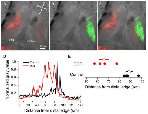 Figure 4. Monocular enucleation at stage 34 results in extended innervation of tectal neuropil by HB axons.(A) Bilateral DiI (red) labeling of HB inputs shows extensive HB axon innervation of the region of neuropil normally occupied by RGC axons in the DCR tectum. (B) DiD (green) labeling of the RGC inputs coming from the intact eye shows RGC axon innervation of control tectum. (C) Merged image of panels A and B. All fluorescent images are superimposed on transmitted light images to show relationship of multisensory axons relative to the tectum. R: rostral, C: caudal, L: lateral, M: medial. (D) Spatial fluorescence intensity plots for the HB axon innervation of control and DCR tectum shown in panel A. Fluorescence intensity is expressed as 8-bit gray value and has been normalized to optimize comparison of the relative profiles of control and DCR tecta. Notice that the profile for the HB axons of the DCR tectum is shifted distally compared to control. (E) A plot showing the distance from the distal edge at which HB fluorescence peaks, for individual control and DCR tecta. Each solid dot represents an individual tecta, and the larger, empty circle shows the corresponding average distance from distal edge at which maximum HB axon fluorescence for control and DCR is observed.DOI: http://dx.doi.org/10.7554/eLife.20502.006 |