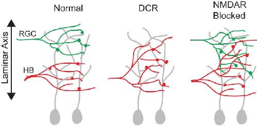 Figure 9. A summary figure showing the effect of monocular enucleation and NMDAR blockade at stage 39.RGC and HB afferent inputs arrive to the tectum at the same time (stage 39) and remain segregated along the laminar axis. Monocular enucleation before as RGC axons are just exiting the eye (stage 34) results in HB axons extending into tectal dendritic territory normally occupied by RGC axons. NMDAR blockade during synapse formation (stage 39), but not after synapses have been stabilized (stage 45), results in the desegregation of RGC and HB axons in the laminar axis.DOI: http://dx.doi.org/10.7554/eLife.20502.011 |