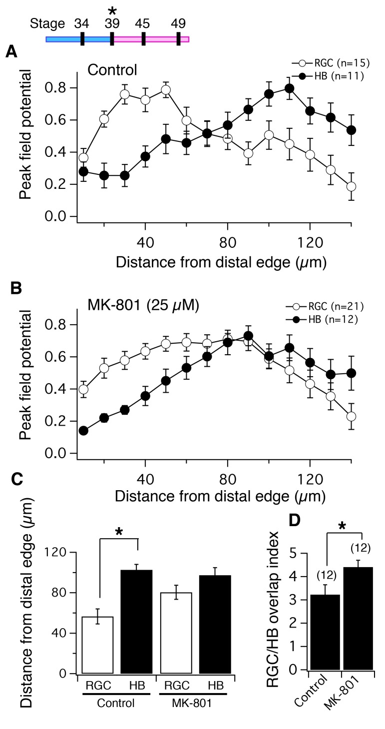 Figure 5. NMDA receptor blockade, starting at stage 39, disrupts the normal degree of spatial segregation between RGC and HB synaptic inputs measured by peak FPs.(Top Left) timeline of experiment. Average normalized peak FPs of RGC (white) and HB (black) inputs along the laminar axis for (A) control tadpoles and (B) tadpoles reared in MK-801. The spatial FP profiles in A show distinct and separated peaks formed by RGC and HB inputs, and this pattern is disrupted in MK-801-reared tadpoles. (C) Average distance from the distal edge at which the largest RGC- and HB-evoked FP amplitudes occurred in control and MK-801 tecta. Notice that this distance is significant in controls but not MK-801-reared tadpoles indicating less segregation. (D) RGC/HB axon overlap, expressed as the overlap index, in control and MK-801-reared tadpoles. There is significantly more overlap in the MK-801 group. Numbers above bars represent number of tecta.DOI: http://dx.doi.org/10.7554/eLife.20502.007 |