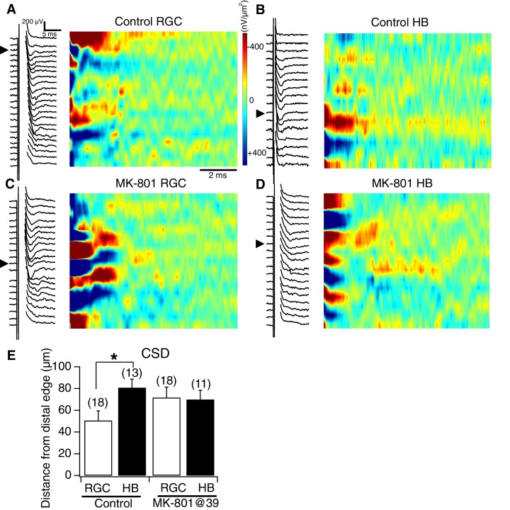 Figure 6. NMDA receptor blockade, starting at stage 39, disrupts the normal degree of spatial segregation between RGC and HB synaptic inputs: sample image plots.(A) Control RGC-evoked FPs with corresponding image plot. Main RGC-evoked sink is localized to the most distal end of the neuropil, with an additional minor sink in the proximal region. (B) Control HB-evoked FPs with corresponding image plot. Main HB sink is localized to the proximal region of the tectal neuropil. (C) MK-801 RGC-evoked FPs with corresponding image plot. Main RGC-evoked sink now appears in the proximal region of the neuropil instead of the distal region. (D) MK-801 HB-evoked FPs with corresponding image plot. Main HB-evoked sink now appears in both the distal region and proximal region of the tectal neuropil. Arrowheads refer to the site of the largest peak FP. (E) Bar graph summarizing the location of major RGC- and HB- evoked CSD sinks along the distal-proximal axis. For control tecta, the distance between the major RGC- and HB-evoked CSD sinks is significant, but not for tecta exposed to MK801 at stage 39.DOI: http://dx.doi.org/10.7554/eLife.20502.008 |