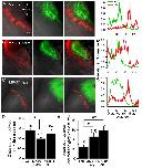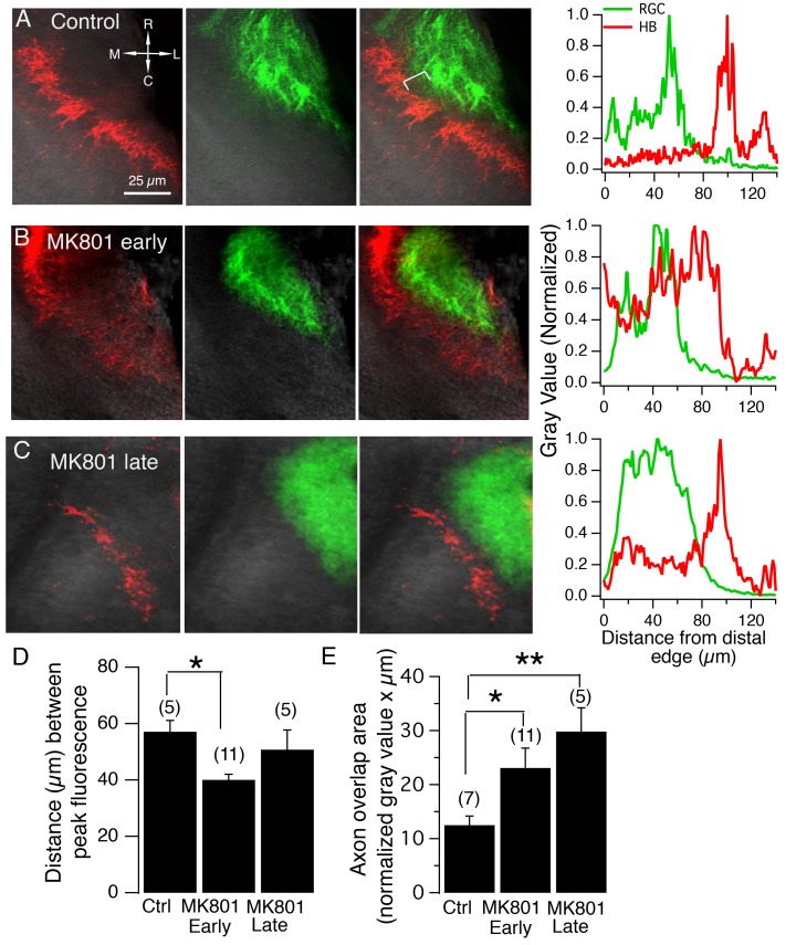 Figure 8. NMDA receptor blockade, starting at stage 39, but not stage 45, disrupt the normal degree of spatial segregation between RGC and HB axons.(A) Control HB afferent input (red) projects to the proximal (medial) region of the tectal neuropil, RGC afferent input (green) projects to the distal (lateral) region of the tectal neuropil. In the merged image, notice the gap, indicated by the white bracket, between two sets of sensory input, and the corresponding gap in peak axon fluorescence shown in the corresponding fluorescent intensity profile (far right). (B) HB and RGC axons innervating the tectum of a tadpole exposed to MK801 at stage 39 (âearlyâ) and corresponding fluorescent profile (far right). There appears to be a less distinct gap between the two inputs, suggesting less segregation. (C) HB and RGC axons of a tadpole exposed to MK801 at stage 45 (âlateâ), and corresponding fluorescent profile (far right). The merged image and fluorescent profile suggest that MK-801 rearing at stage 45 does not disrupt the segregation along the tectal neuropil at stage 49. Notice the gap between the two sets of input. (D) Bar graph summarizing the distance between peak HB and RGC axon fluorescence. (E) Bar graph summarizing the amount of overlap between HB and RGC axons. R: rostral, C: caudal, L: lateral, M: medial.DOI: http://dx.doi.org/10.7554/eLife.20502.010 |