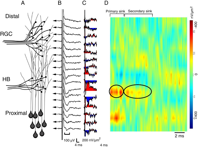 Figure 2. The spatial pattern of synaptic input is determined by recording RGC- and HB-evoked synaptic field potentials at equidistant points along the distal-proximal neuropil.(A) Simplified schematic of the tectal neuropil showing RGC (distal) and HB (proximal) axonal inputs onto tectal neuron dendrites. RGC and HB-evoked synaptic field potentials are recorded every 10 µm along the distal-proximal axis of the neuropil. (B) An example of RGC-evoked FPs recorded from across the distal-proximal axis of a single optic tectum. (C) Corresponding current-source density (CSD) profile derived using spatial differentiation grid of 20 µm. (D) Corresponding image plot generated using same CSD data. Red indicates current sink, blue indicates current source. Main RGC-evoked sink is localized at the distal end of the neuropil (circled primary sink). A small, more proximal sink is also commonly observed. Note that the main primary sink is followed by the recurrent portion of the response (circled secondary sink), which consistently appears in the same region as the primary sink. L: lateral, M: medial.DOI: http://dx.doi.org/10.7554/eLife.20502.003Figure 2—figure supplement 1. Spatial pattern of synaptic input is determined by recording RGC- and HB-evoked synaptic field potentials at equidistant points along the distal-proximal neuropil, an example of an HB-evoked response.(A) Simplified schematic of the tectal neuropil showing RGC (distal) and HB (proximal) axonal inputs onto tectal neuron dendrites. RGC and HB-evoked synaptic field potentials are recorded every 10 µm along the distal-proximal axis of the neuropil. (B) An example of HB-evoked FPs recorded from across the distal-proximal axis of a single optic tectum. (C) Corresponding current-source density (CSD) profile derived using spatial differentiation grid of 20 µm. (D) Corresponding image plot generated using same CSD data. Red indicates current sink, blue indicates current source. Main HB-evoked sink is localized to the proximal region of the laminar axis of the neuropil (circled primary sink). Note that, as with the RGC-evoked response, the main primary sink is followed by the recurrent portion of the response (circled secondary sink), which consistently appears in the same region as the primary sink. L: lateral, M: medial.DOI: http://dx.doi.org/10.7554/eLife.20502.004 |