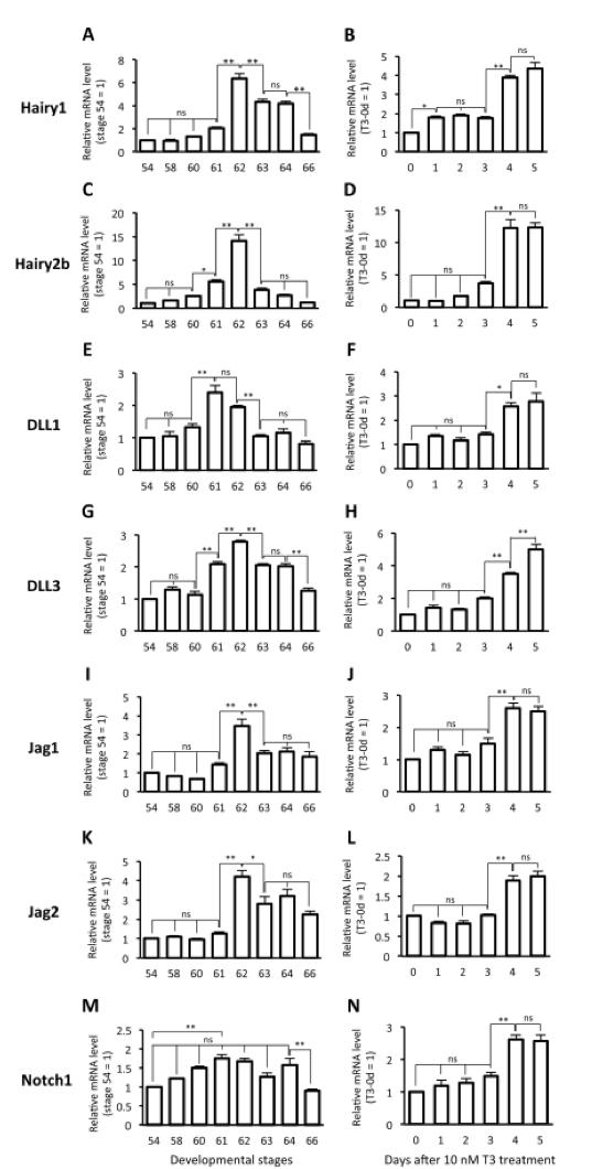 Expression profiles of genes involved in Notch signaling in X. laevis intestine during natural and T3-induced metamorphosis. Quantitative real-time RT-PCR was performed using total RNAs prepared from the intestine of animals at indicated developmental stages (A, C, E, G, I, K, M) or stage-54 tadpoles after 10 nM T3 treatment (B, D, F, H, J, L, N). Levels of Hairy1 (A, B), Hairy2b (C, D), DLL1 (E, F), DLL3 (G, H), Jag1 (I, J), Jag2 (K, L), and Notch1 (M, N) mRNAs are shown relative to those of ribosomal protein L8 (rpL8) mRNA, with the values at stage 54 or 0-day treatment set to 1. Error bars represent the SEM (nâ=â7 for A-D; nâ=â3 for E-H, J, M, N; nâ=â8 for I, L; nâ=â5 for K). The values were analyzed by ANOVA followed by Scheffe's post hoc test whose results are shown only for the adjacent stages or days except for Notch1 (M). Asterisks indicate that the mRNA levels are significantly different. *, pâ<â.05, **, pâ<â.01; ns: not significant.