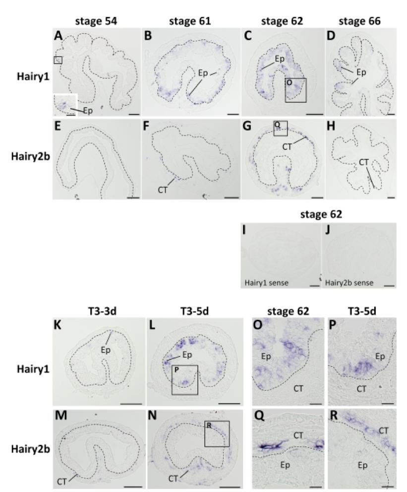 Localization of Hairy1 and Hairy2b mRNAs in the X. laevis intestine during natural and T3-induced metamorphosis. Cross-sections of the intestine from animals at premetamorphic stage 54 (A, E), metamorphic climax stages 61 (B, F) and 62 (C, G, I, J, O, Q), and the end of metamorphosis (stage 66; D, H), and stage-54 tadpoles treated with 10 nM T3 for 3 days (K, M) and 5 days (N, L, P, R) were hybridized with antisense Hairy1 (A-D, K, L, O, P), Hairy2b (E-H, M, N, Q, R), or their sense probes (I, J). Dark blue deposits indicate the sites of probe binding. Light or dark brown pigments in some pictures are melanin. Hairy1 is expressed in the epithelium (Ep), whereas Hairy2b is expressed in the connective tissue (CT). The boxed area in panel A is magnified to show the localization of Hairy1 expression in the larval Ep (panel A, inset). The boxed areas in panels C, G, L, N are magnified and shown in panels O, Q, P, R, respectively. The dashed-lines indicate the boundary of Ep and CT. Scale barsâ=â100 μm (A-L), 20 μm (inset of A, O-R). Abbreviation: CT, connective tissue, Ep, epithelium.