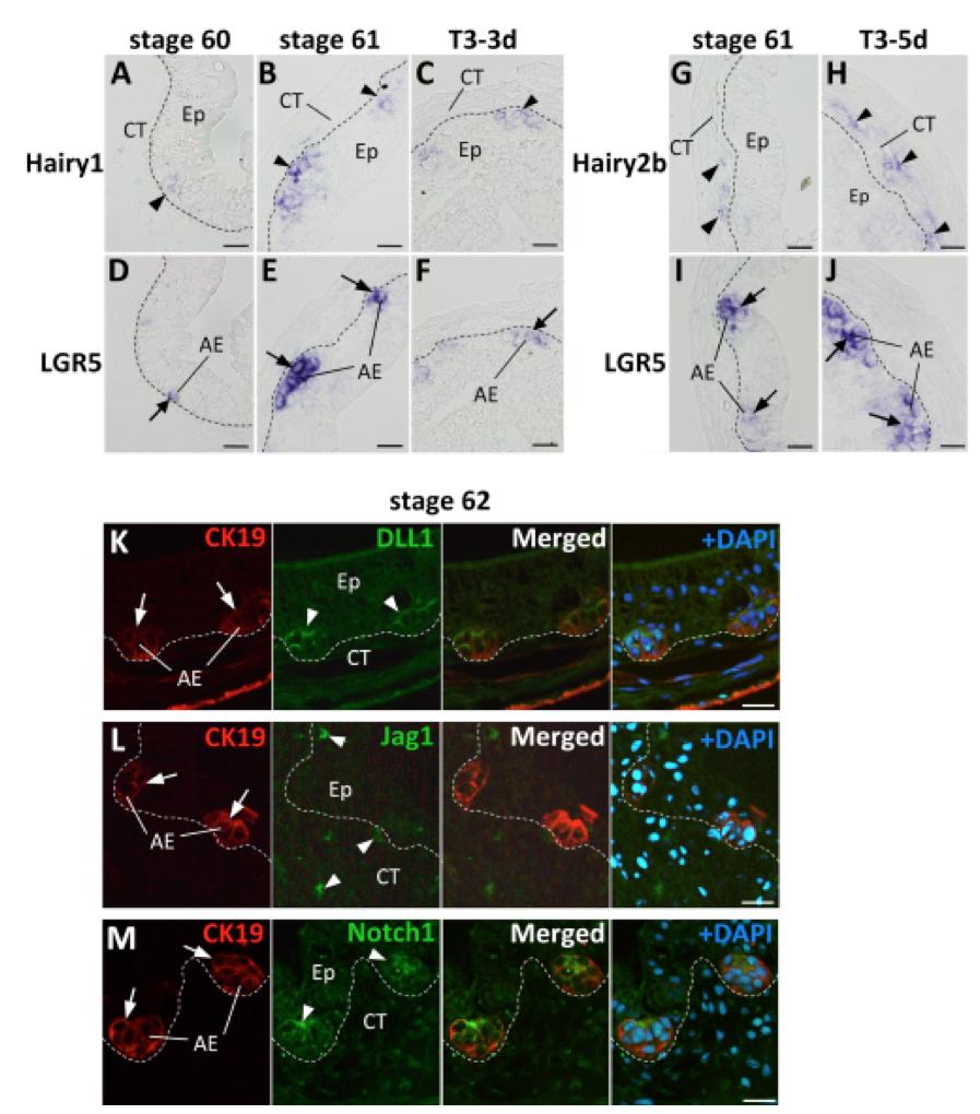 Correlation of the expression patterns of Notch pathway components with that of a stem/progenitor marker in the metamorphosing intestine. Cross-sections of the intestine from tadpoles at stages 60 (A, D) and 61 (B, E, G, I), and stage-54 tadpoles treated with 10 nM T3 for 3 (C, F) and 5 days (H, J) were hybridized with antisense Hairy1 (A-C) or Hairy2b (G, H) probes. The corresponding serial sections were hybridized with antisense LGR5 probe (D-F, I, J) for comparison. Hairy1 is expressed in the adult epithelial stem (AE)/progenitor cells (A, arrowhead) when they first appear as the small islets expressing LGR5 (D, arrow) at stage 60. These islets grew in size as metamorphosis proceeded and continued to co-express Hairy1 (B, arrowheads) and LGR5 (E, arrows). During T3-induced metamorphosis, Hairy1 (C, arrowhead) is also expressed in the AE/progenitor cells expressing LGR5 (F, arrow) after 3 days of T3 treatment. Some, although not all, cells expressing Hairy2b were in the connective tissue (CT) (G, arrowheads) underlying the AE/progenitor cells expressing LGR5 (I, arrows). Hairy2b is also expressed in the CT after 5 days of T3 treatment (H, arrowheads), again, with some underlying the AE/progenitor cells (J, arrows). Cross-sections of the intestine from tadpoles at stage 62 were double-immunostained with anti-CK19 to detect the islet of AE/progenitor cells (K-M, red) and anti-DLL1 (K, green), anti-Jag1 (L, green), or anti-Notch1 (M, green) followed by counterstaining with DAPI (K-M, blue). DLL1 (K, arrowheads) and Notch1 (M, arrowheads) are expressed in the islets (arrows). The cells expressing Jag1 are scattered in both the larval Ep and CT with some just beneath the islet, but not in the islets (L, arrowheads). The dashed-lines indicate the boundary of the Ep and the CT. Scale barsâ=â20 μm. Abbreviations: AE, adult epithelial stem/progenitor cells, CT, connective tissue, Ep, epithelium.