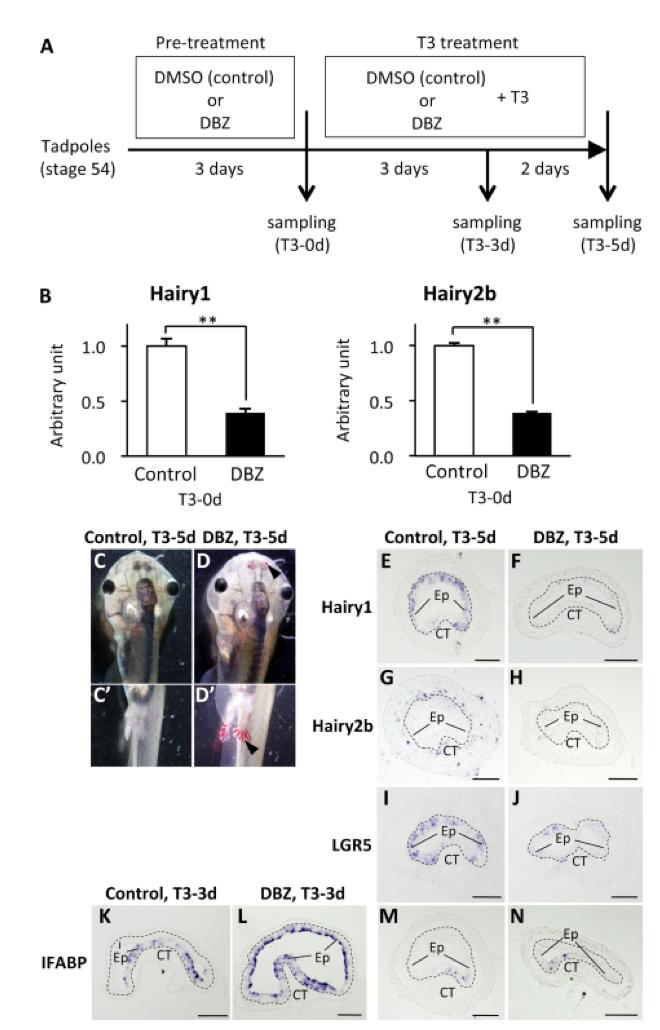 Inhibition of Notch signaling with dibenzazepine (DBZ) inhibits intestinal metamorphosis. (A): Schematic diagram of DBZ treatment study. Premetamorphic tadpoles at stage 54 were pretreated with DMSO (control vehicle) or 5 μM DBZ for 3 days. Then, the tadpoles were treated with 10 nM T3 in the presence of DMSO or DBZ. The intestine was isolated after 0, 3, or 5 days of T3 treatment and subjected to RNA extraction or cryosectioning. (B): quantitative real-time RT-PCR revealed that pretreatment with DBZ significantly repressed the expression of Hairy1 and Hairy2b in the intestine of premetamorphic tadpoles. Error bars represent the SEM (nâ=â3). The results were analyzed by Student's t-test (**, pâ<â.01). (C-D'): Gross morphology after 5 days of T3 treatment in the presence of DMSO (C, C') or DBZ (D, D'). Dorsal view of headâtrunk region (C, D) and ventral view of hindlimbs (C', D') are shown. Internal hemorrhage around the nose and along the digits of hindlimb is indicated by arrowheads (D, D'). (E-N) DBZ treatment delays the down-regulation of IFABP and the formation of the adult intestinal stem cells. Cross-sections of the intestine from the tadpoles treated with T3 for 3 (K, L) or 5 (E-J, M, N) days in the presence of DMSO (E, G, I, K, M) or DBZ (F, H, J, L, N) were hybridized with antisense Hairy1 (E, F), Hairy2b (G, H), LGR5 (I, J), or IFABP (K-N) probes. The dashed-lines indicate the boundary of the epithelium and the connective tissue. Scale barsâ=â100 μm. Abbreviations: CT, connective tissue, DBZ, dibenzazepine, Ep, epithelium. |