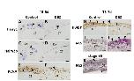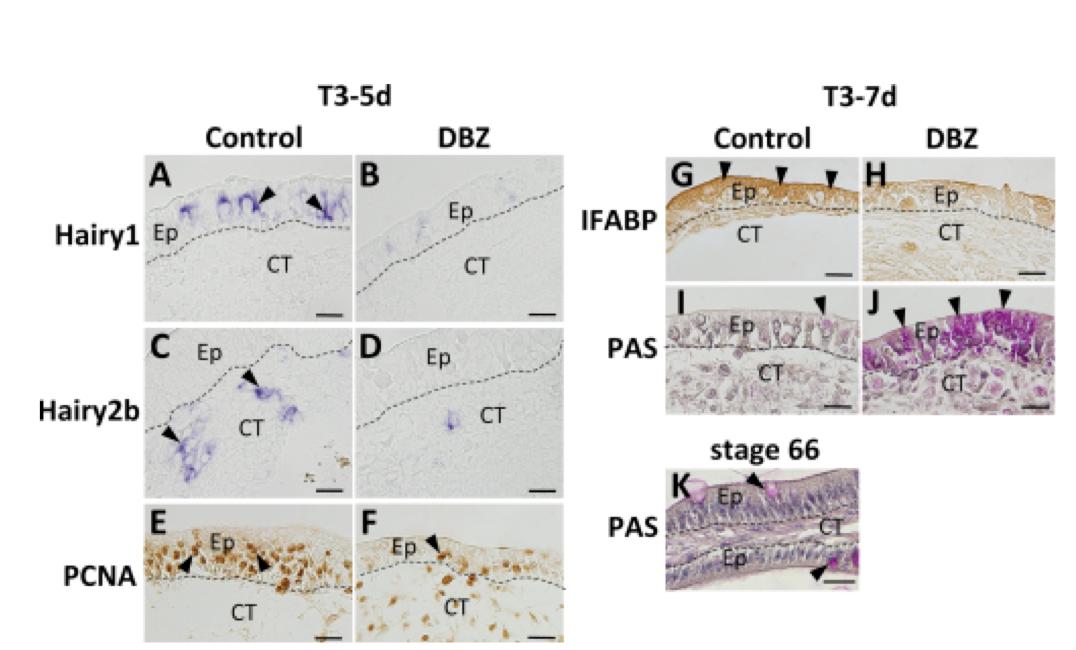 Inhibition of Notch signaling by dibenzazepine (DBZ) leads to decreased cell proliferation and secretory cell hyperplasia. The intestine isolated from stage-56/57 tadpoles was cultured with 20 nM T3 for 5 (A-F) or 7 (G-J) days in the presence of DMSO (A, C, E, G, I) or 10 μM DBZ (B, D, F, H, J) after precultivation of the isolated intestinal fragments with DMSO or 10 μM DBZ for 3 days (see Fig. 4A). Cryosections of the intestinal fragments were hybridized with antisense Hairy1 (A, B) or Hairy2b (C, D). Paraffin sections were incubated with anti-PCNA (E, F) or anti-IFABP (G, H) antibodies or subjected to Periodic acid-Schiff (PAS) staining followed by counter-staining with hematoxylin (I, J). As a control, paraffin sections of the intestine from wild type froglets at stage 66 were also stained with PAS to identify goblet cells (K, arrowheads). Note that after 5 days, TH-induced up-regulation of Hairy genes (A, C, arrowheads) was impaired by DBZ treatment in vitro (B, D). PCNA-positive epithelial cells also decreased by DBZ treatment (E, F, arrowheads). After 7 days, IFABP was detected in most of the newly formed adult epithelial cells of the control intestine (G, arrowheads), but not the DBZ-treated intestine (H). A small number of goblet cell was detected in the control intestine (I, arrowhead), whereas PAS-positive secretory cells increased by DBZ treatment (J, arrowheads). The dashed-lines indicate the boundary of the epithelium and the connective tissue. Scale barsâ=â20 μm. Abbreviations: CT, connective tissue, DBZ, dibenzazepine, Ep, epithelium, PAS, Periodic acid-Schiff |
