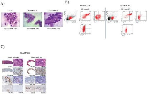 Figure 5. A. Representative cytomorphological analysis of bone marrow cytospins of diseased mice as indicated (AE/VENTX 1° and 2°) compared to a representative non-leukemogenic AE 1° mouse. B. Representative flow cytometric analysis of a primary AE/VENTX recipient mouse (left side) and a secondary AE/VENTX recipient mouse (right side) C. Histological analysis of two secondary transplanted AE/VENTX mice, showing erythroblasts in the spleen of the diseased animals.