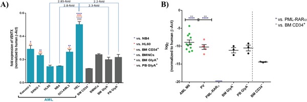 Figure 2. A. Quantitative expression of VENTX in different AML cell lines compared to BM CD34+/BMNCs/BM GlyA+/PB GlyA+. All expression analyses were performed by TaqMan® qRT-PCR with (+)RT and (-)RT reaction samples. Fold expression values were obtained by normalizing the expression of the gene of interest (VENTX) to the endogenous human β-actin (β-Act). Bars are showing the average fold expression ± SEM. *: p≤0.05, **: p≤0.001, ***: p≤0.0001, ****: p<0.0001. B. Mean Quantitative expression of VENTX AML M6 and PML-RARα positive AML samples compared to Glycophorin A from BM/PB and CD34+ bone marrow cells. All expression analyses were performed by TaqMan® qRT-PCR with (+)RT and (-)RT reaction samples. Log2 fold expression values were obtained by normalization of the expression of the gene of interest (VENTX) to the endogenous human β-actin. Bars are showing the log2 fold expression ± SEM. **: p≤0.001 and ****: p<0.0001. ○ indicates no detectable expression for 5 individual samples of PML-RARα positive AML cases (for up to 37 cycles).