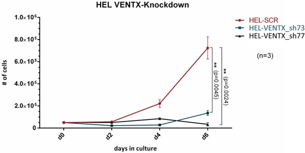 Figure 3. Cell proliferation in liquid expansion cultures from HEL cells after shRNA mediated knockdown of VENTX (shVENTX_73, shVENTX_77) compared to the scrambled control. Knockdown efficiency was 99% for both shRNA constructs (n=3).