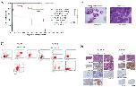 Figure 4. A. Kaplan-Meier survival curves of mice transplanted with 5-FU stimulated transduced BM cells expressing AML1-ETO+VENTX [AE/VENTX 1°] (n=20), VENTX [VENTX 1°] (n=18), empty vector control (n=18) and AML1-ETO [AE 1°] (n=15). Secondary and tertiary transplantations are shown for leukemic mice: AE/VENTX 2° (n=14), AE/VENTX 3° (n=9), VENTX 2° (n=19), VENTX 3° (n=4). AE/V 1° - V 1° V = VENTX: **, p= 0.0011; AE/V 1° - empty vector control 1°: ****, p<0.0001; AE/V 1° - AE1°: ****, p <0.0001; V 1° - empty vector control 1°: n.s. (n.s. = not significant); V 1° - AE1°: ns; AE/V 2° - V 2°: ns; AE/V 3° - V 3°: ns. B. Representative cytomorphological analyses of bone marrow of a diseased VENTX transplanted 1° mouse compared to an empty vector control mouse. C. Representative flow cytometric analysis of a primary VENTX recipient mouse (left side) and a secondary VENTX recipient mouse (right side) D. Histological analysis of primary (left side) and secondary (right side) VENTX recipient mice.