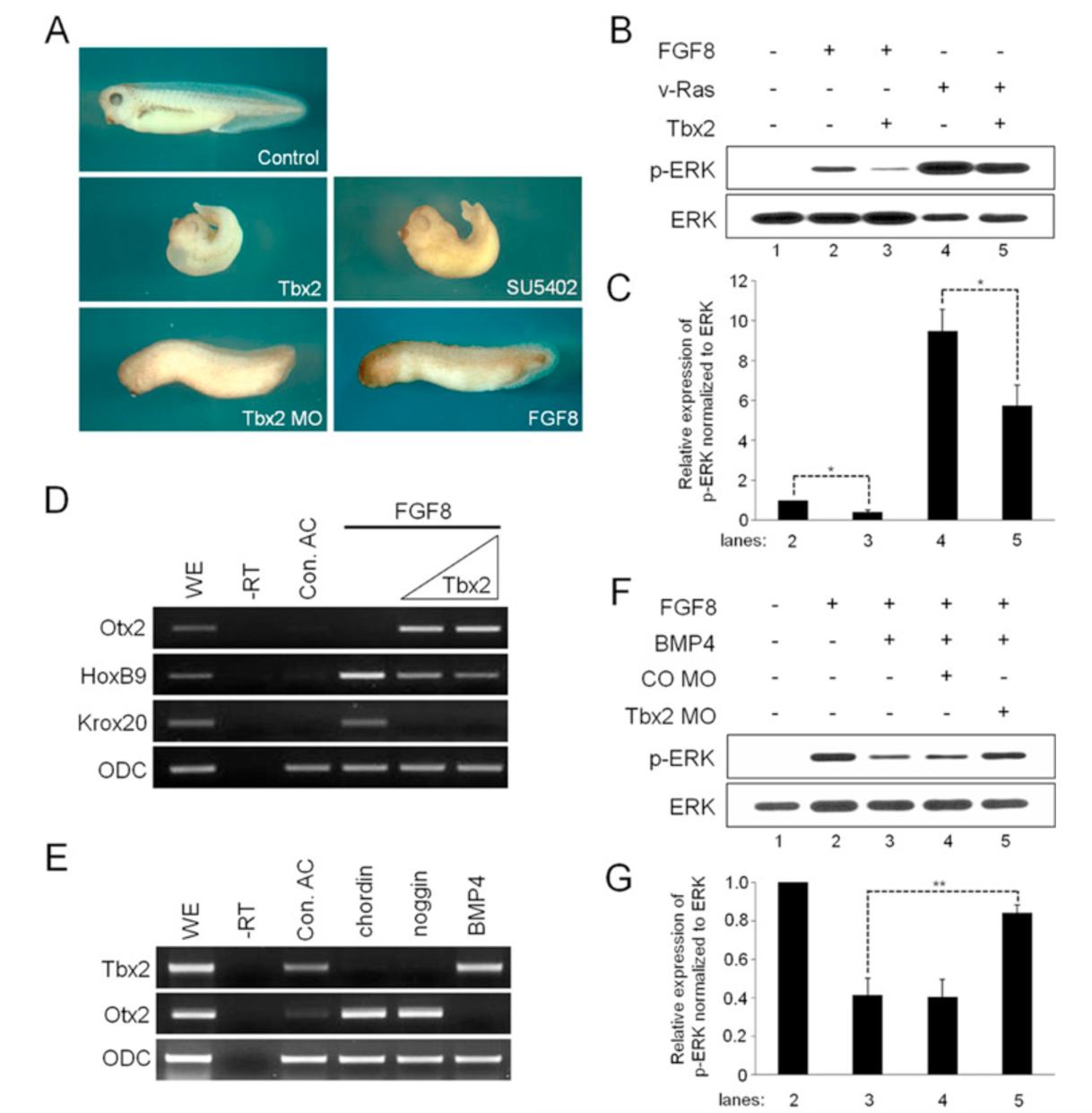 Tbx2 acts as a target gene of BMP pathway to inhibit FGF signaling. (A) Phenotypes of embryos injected animally with Tbx2 (200 pg), Tbx2MO (10 ng) or FGF8 (200 pg) or treated with SU5402 (20 μM) from the four-cell stage to tadpole stage. Control, an uninjected control embryo. (B-G) Animal caps from the embryos injected animally with the indicated combination of FGF8 (1 ng), v-Ras (50 pg), Tbx2 (B, 200 pg; D, 100â200 pg), chrodin (200 pg), noggin (10 pg), BMP4 (200 pg), Tbx2 MO (10 ng) and CO MO (10 ng) were cultured to stage 12 for western blotting (B, C, F, G) and to stage 15 for RT-PCR analysis (D, E). (C) and (G) show quantification of the levels of p-ERK (normalized to ERK) for (B) and (F), respectively. Error bars indicate the standard error (SE) from three independent experiments. Asterisks above the bars denote *p-value <0.05 and **p-value <0.01. ODC serves as a loading control. WE, whole embryo. Con. AC, uninjected control animal caps. âRT, a control in the absence of reverse transcriptase.