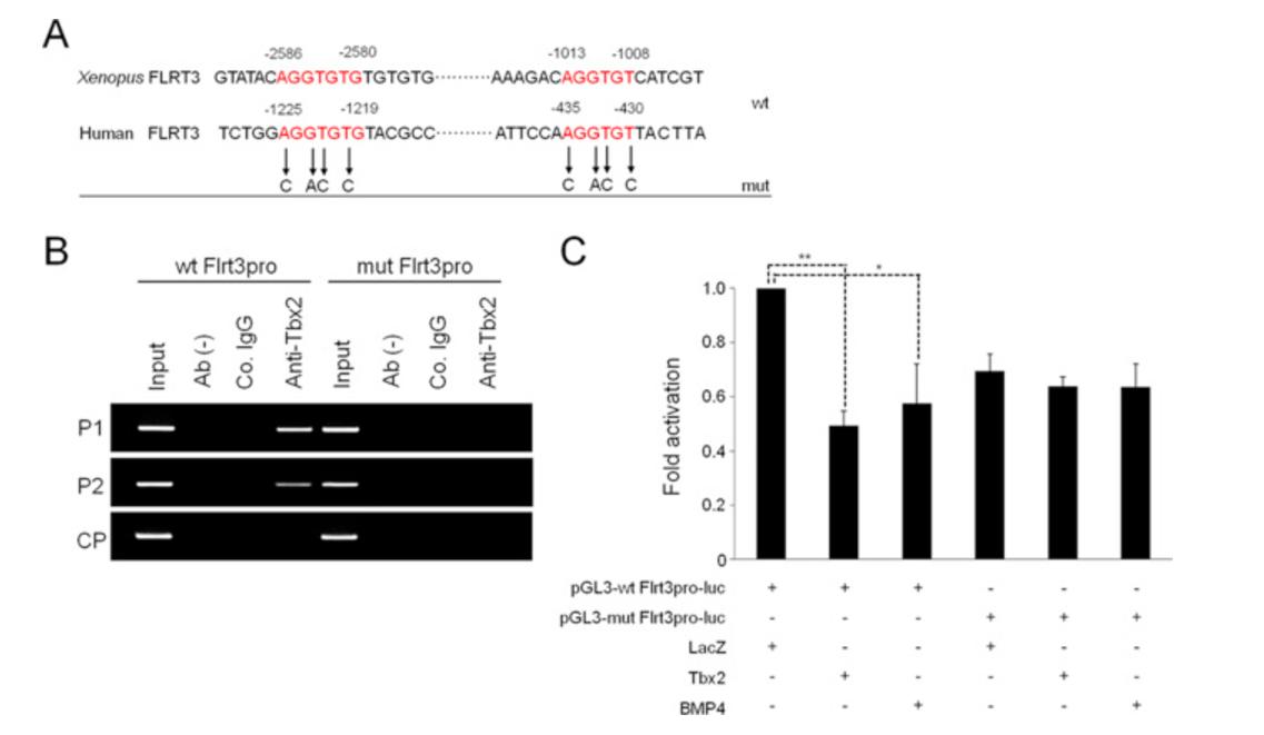 Tbx2 binds to the promoter of Flrt3 gene. (A) Alignment of wild-type (wt) putative T-box binding sites (in red) in the promoter regions of Xenopus and human Flrt3 and the sequence of the mutant (mut) binding sites. (B) Chromatin immunoprecipitation (ChIP) analysis using HEK 293 T cells transfected with human Tbx2 along with DNA constructs harboring wild-type or mutant T-box binding sites of human Flrt3. P1, P2 and CP denote primers used for PCR reactions (Materials and Methods). Input, promoter DNA in cross-linked DNA-protein mix before immunoprecipitation. Ab (-), immunoprecipitation without antibody. Co. IgG, control rabbit IgG. (C) Suppression of the activity of Flrt3 promoter-driven reporter by Tbx2 or BMP4 requires T-box binding sites. Embryos were injected dorsally with pGL3-wt Flrt3pro-luc (40 pg), pGL3-mut Flrt3pro-luc (40 pg), LacZ (200 pg), Tbx2 (200 pg) and BMP4 (200 pg) as indicated and incubated until stage 11, when firefly and Renilla luciferase activities were determined. Each experiment was carried out in triplicate and error bars indicate the standard error (SE) from three independent experiments. *p-value <0.05 and **p-value <0.01. (For interpretation of the references to color in this figure legend, the reader is referred to the web version of this article.)