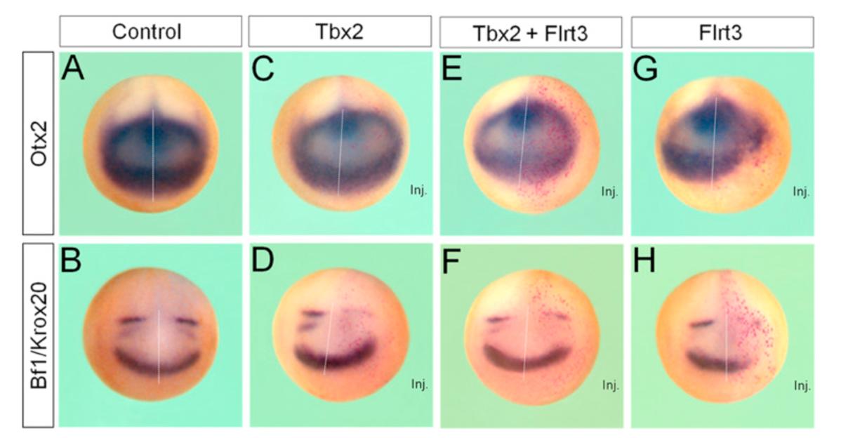 Tbx2 functions as a repressor of Flrt3 expression during anterior neural formation. (A-H) One blastomere of four-cell stage embryo was injected dorso-animally as indicated with Tbx2 (200 pg) and Flrt3 (200 pg) along with LacZ RNA and cultured to stage 15 for in situ hybridization against Otx2, Bf1 or Krox20. Embryos are shown in anterior view with dorsal to the top. Control, uninjected control embryo. Inj. indicates the injected side of embryo.