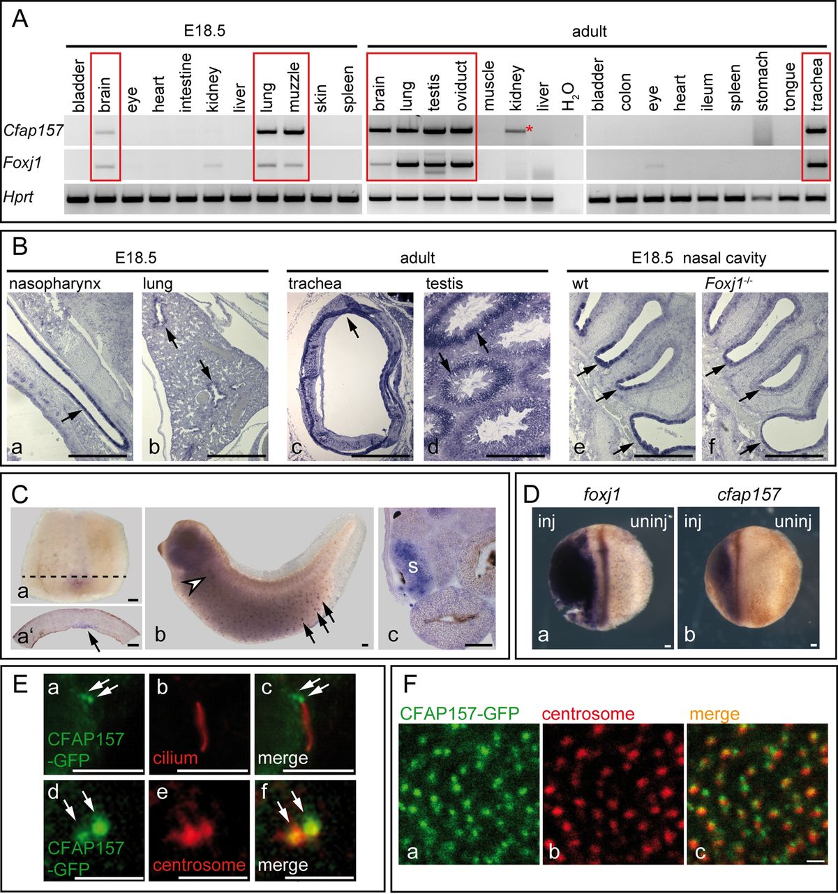 Cfap157 cDNA probe on E18.5 and adult wild-type mouse tissues, as well as E18.5 Foxj1 wild-type (wt) and Foxj1-deficient (Foxj1â/â) sagittal nose sections.