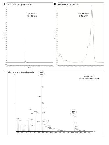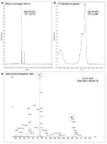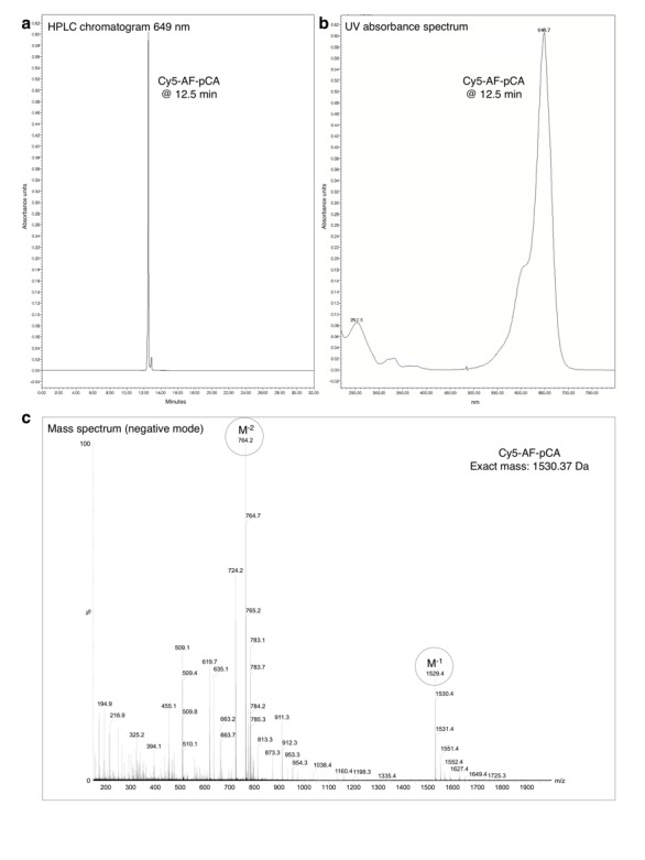 Figure 1—figure supplement 3. HPLC chromatogram (A), UV absorbance spectrum (B) and LRMS (C) of Cy5-AF-pCA.DOI: http://dx.doi.org/10.7554/eLife.19088.006 |