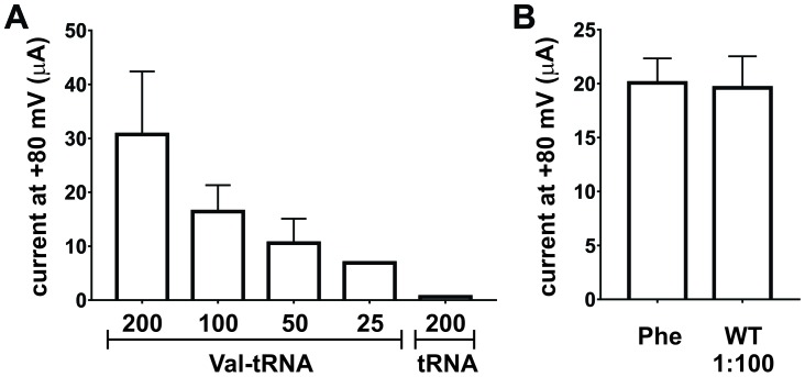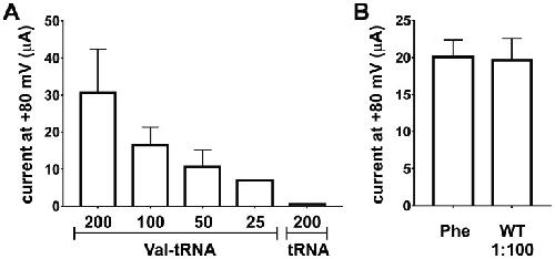 Figure 3âfigure supplement 2. Nonsense suppression efficiency at position E166 in ClC-0.(A) Optimization of tRNA amounts for nonsense suppression of ClC-0 E166TAG. Oocytes were injected with 7.5 ng of ClC-0 E166TAG cRNA and decreasing Val-tRNA amounts (200/100/50/25 ng per oocyte). As negative control non-acylated tRNA (no AA) was coinjected (200 ng per oocyte). Values represent current amplitudes as mean ± s.e.m. (N = 4 for 1; N = 4 for 1/2; N = 3 for 1/4; N = 3 for 1/8; N = 5 for no AA; from 1 batch of oocytes). (B) Injecting a 100-fold dilution of wild-type (WT) ClC-0 cRNA (0.075 ng per oocyte) produced currents at +80 mV similar in amplitude to ClC-0 E166TAG rescued currents with Phe, where 7.5 ng of cRNA was injected per oocyte. Values are shown as mean ± s.e.m. (N = 30 for Phe, N = 5 for WT from at least three independent batches).DOI: http://dx.doi.org/10.7554/eLife.19088.013 |