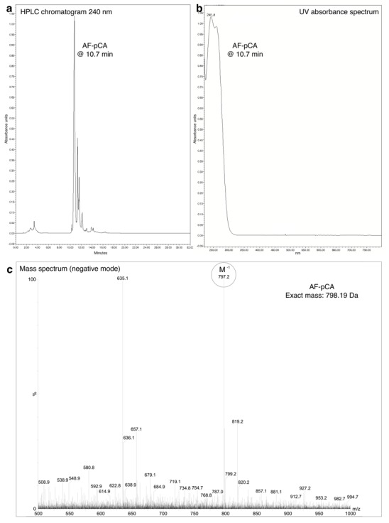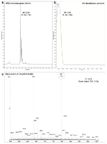 Figure 1—figure supplement 1. HPLC chromatogram (A), UV absorbance spectrum (B) and LRMS (C) of AF-pCA.DOI: http://dx.doi.org/10.7554/eLife.19088.004 |