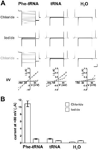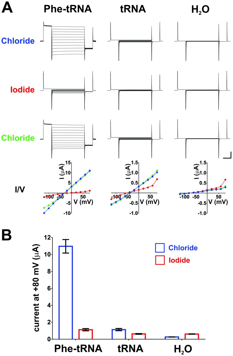 Figure 3—figure supplement 1. Iodide blocks ClC-0 E166Phe currents, indicating that they are indeed ClC-0 mediated.(A) Oocytes injected with ClC-0 E166TAG cRNA and Phe-tRNA (left) or ClC-0 E166TAG cRNA and non-acylated tRNA (center) or with water (H2O, right) were perfused with the following sequence of ions: Chloride (blue), Iodide (red), Chloride (green). Representative current traces for each condition and the corresponding current-voltage (I/V) relationships are shown (vertical scale bar: current, 5 µA; horizontal scale bar: time, 50 ms). In Cl--containing saline reversal potentials were estimated to be ~−30 mV for Phe-tRNA (left), ~−40 mV for tRNA and ~−65 mV for H2O (right) injected oocytes. (B) Averaged currents evoked by a +80 mV pulse in Chloride and Iodide, respectively, are shown as mean ± s.e.m. for each condition (n = 7 for Phe-tRNA, n = 5 for tRNA, n = 5 for H2O; from 2–3 different batches of oocytes).DOI: http://dx.doi.org/10.7554/eLife.19088.012 |