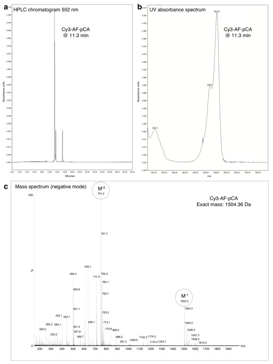 Figure 1—figure supplement 2. HPLC chromatogram (A), UV absorbance spectrum (B) and LRMS (C) of Cy3-AF-pCA.DOI: http://dx.doi.org/10.7554/eLife.19088.005 |