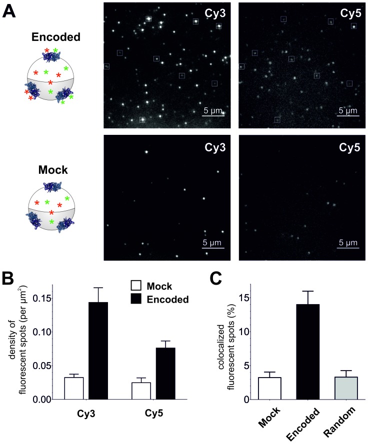 Figure 4. Single-molecule TIRF microscopy imaging of cellular encoded Cy3 and Cy5 fluorophores in ClC-0, a dimeric plasma membrane chloride channel.(A) TIRF images show distinct fluorescent spots for Cy3 and Cy5 encoded into ClC-0 at position E166 (Encoded (top), Mock (bottom)). A subpopulation of Cy3 and Cy5 spots colocalized (highlighted in white boxes). The encoded and mock injected images were grayscaled to identical levels to enable viewing of both bright and dim spots. (B) Number density of fluorescent spots per area (µm2) of plasma membrane was significantly different between Encoded (black) and Mock (white). p values see main text. Total numbers of counted spots included in this analysis are: N = 4406 for encoded Cy3, N = 2459 for encoded Cy5, N = 1154 for mock Cy3, N = 717 for mock Cy5; they result from ≥5 oocytes (≥3 batches) per condition (C) Same images as in (B) were examined for colocalization between Cy3 and Cy5. In Encoded, 14 ± 2% of the Cy5 signal merged with Cy3. Random colocalization in those images was estimated to 3 ± 1% and colocalization in Mock was not significantly different from that (p=0.96). All values are mean ± s.e.m.DOI: http://dx.doi.org/10.7554/eLife.19088.014 |