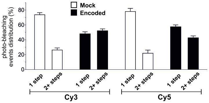 Figure 5—figure supplement 1. Photo-bleaching profiles for Cy3 and Cy5 spots in Encoded and Mock.For clarity, results from Figure 5C are shown here as relative photo-bleaching event distributions. In each case, the Encoded conditions produce a statistically significant difference (p<0.0001) over Mock distributions. All values are mean ± s.e.m. In total, following numbers were included: N = 1564 for encoded Cy3, N = 762 for encoded Cy5, N = 296 for mock Cy3, N = 300 for mock Cy5.DOI: http://dx.doi.org/10.7554/eLife.19088.016 |