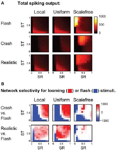Figure 4. The effect of balance between recurrent and direct inputs to the tectum on stimulus selectivity (A). The total number of spikes (shown as pixels of different color, from black to white) generated in model networks with different strength of direct (horizontal axes) and recurrent (vertical axes) synaptic inputs, for different stimulus types (rows), and recurrent network topologies (columns) (B). The comparison of looming stimuli responses to full-field flash responses. Here color encodes the reliability (signed F-value) of getting a stronger total network response to either looming (red), or flash (blue) stimulus, for different strengths of direct (SR) and recurrent (ST) synaptic inputs. Networks with strong direct and recurrent synaptic inputs are selective for looming stimuli (red in the top right corner), while weakly connected networks are selective for full-field flashes (blue crescents in the left lower corner). This pattern is present, but less pronounced for fast looming stimuli, and in scale-free networks. |