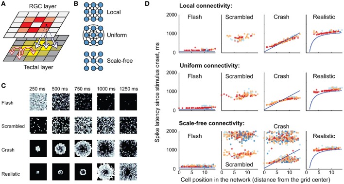 Figure 2. Network model, retinal inputs, and network responses. (A) The basic topology of the model network: a grid of retinal ganglion cells (RGCs) made a “blurred” retinotopic projection to the tectal layer (black arrows), with recurrent connections within the tectal layer (red arrows). Different colors schematically show relative activation of RGCs and tectal cells during visual stimulus processing. (B) Three possible options for the recurrent intra-tectal connectivity: local (neurons are connected only to their neighbors); uniform (connections between any two neurons are equally probable); and scale-free (small-world network with highly connected hub cells). (C) Snapshots of RGC layer spiking, representing four visual stimuli: instantaneous full-field flash; randomly rearranged (scrambled) looming stimulus; linearly expanding looming stimulus (crash); and realistic non-linearly expanding looming stimulus. Each square shows a “still frame” from a dynamic response, taken in 250 ms increments after the stimulus onset (0 ms); with more recent spikes within each 250 ms window shown in lighter shades of gray. (D) Sample rasters of spiking responses in the tectum, generated for different recurrent connectivity profiles (rows), and different visual stimuli (columns). The horizontal axis presents model cell positions as distance from the 20 × 20 grid center; vertical axis shows spike latency; blue lines for crash and realistic stimuli show the theoretical time at which each tectal cell is directly engaged by the visual stimulus through the corresponding retinal cell. Cells of different spiking phenotypes are shown in different colors, from most spiky (red) to least spiky (dark blue). |