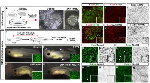 Figure 5. A: Schematic showing the steps in the cell spreading assay. B: 24âhr after explanting epidermis and treating it with DMSO (control). C: 24âhr after explanting epidermis and treating it with the JNK inhibitor. D: Schematic showing the treatment paradigm for the EGTA adhesion assay. E: Control embryo treated with DMSO only. Inset shows E-cadherin labeling confined to edges of cells. F: Representative embryo treated with DMSO followed by EGTA. White arrows point toward regions where the tissue is dissociating. Inset shows internalized E-cadherin. G: Embryo treated with JNK inhibitor alone. Inset shows E-cadherin labeling confined to cell boundaries. H: Embryo treated with JNK inhibitor followed by EGTA. Inset shows E-cadherin largely confined to the cell boundaries. I: The epidermis of a representative embryo showing the cells containing fluorescein labeled Control MO (green) and E-cadherin labeled in red. Iâ²: Corresponding image from I showing only the E-cadherin labeling in red. Iâ²: Corresponding image from I showing only the E-cadherin labeling in black and white. Insets show representative 1â2 cells at 2âÃâmagnification. J: The epidermis of a representative embryo showing the cells containing fluorescein labeled JNK1 MO (green) and E-cadherin labeled in red. Jâ²: Corresponding image from J showing only the E-cadherin labeling in red. Jâ²: Corresponding image from J showing only the E-cadherin labeling in black and white. Insets show representative 1â2 cells at 2âÃâmagnification. Black arrows indicate groups of cells with higher levels of E-cadherin at the membrane. KâL: E-cadherin labeling of epidermis from representative embryos (stage 24â26) that were uninjected (K,Kâ²) or injected with CA-JNK (L,Lâ²). Prime letters are the identical pictures in black and white. Insets show a two-fold magnified image of a cell from the images. White arrows show what appears as puncta of E-cadherin positive bodies within the cytoplasm and arrowheads point to membranes with reduced E-cadherin. Insets show representative 1â2 cells at 2âÃâmagnification. MâN: Clathrin labeling of epidermis from representative embryos (stage 24â26) that were uninjected (M,Mâ²) or injected with CA-JNK (N,Nâ²). Prime letters are the identical pictures in black and white. Insets show representative 1â2 cells at 2âÃâmagnification. White arrows indicate nonspecific staining where fluorescence is observed on top of the cell. |