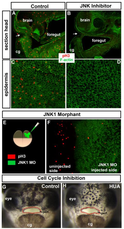 Figure 3. AâD: Shows phospho-histone H3 (ph3; red) marking mitotic cells and labeling of F-actin with phalloidin (green) is used as a counterstain. White arrows indicate the embryonic mouth. A,B: Sagittal section through the middle of the embryo at stage 37/38 after treatment with DMSO/control (A) or JNK inhibitor (B). C,D: Epidermis at stage 37/38 after treatment overnight with DMSO/control (C) or JNK inhibitor (D). E: Schematic showing the morpholinos injected into one cell at the two cell stage and the key where the morpholino can be seen in green and ph3 is labeled in red. F: Dorsal view of an embryo injected as shown in E. G,H: Frontal views of embryos treated with DMSO (control; G) or cell cycle inhibitors hydroxyurea and aphidicolin (HUA; H). Red dots outline the embryonic mouth. cg, cement gland; MO, morpholino; ph3, phospho histone H3; perf, perforated. |