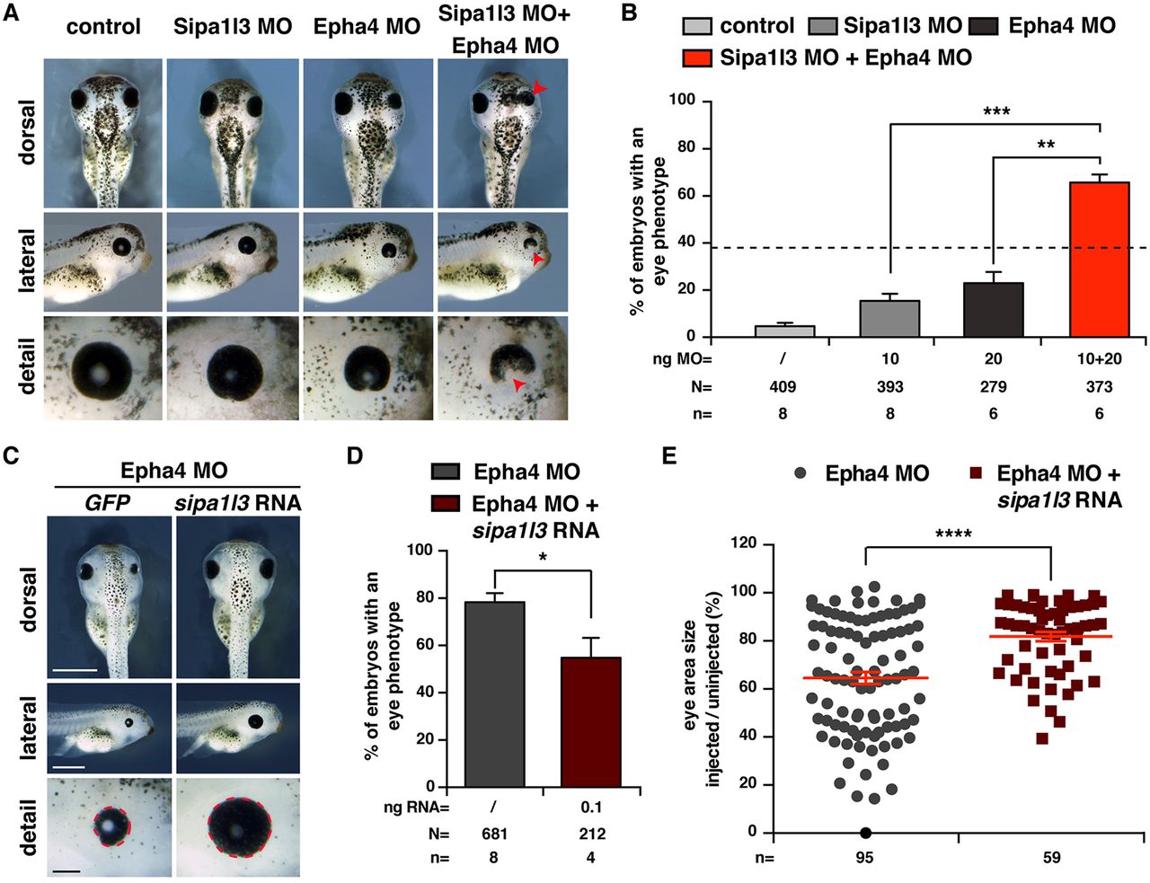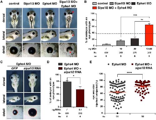 Fig. 5. Sipa1l3 acts downstream of Epha4 during Xenopus eye development. (A) Injection of Sipa1l3 and Epha4 MO showed a synergistic effect. Injection of low Sipa1l3 or Epha4 MO doses resulted in a mild eye phenotype in some embryos. Co-injection of both MOs, however, resulted in a severe eye phenotype in a more than additive manner. (B) Quantification of the data in A. (C) The eye phenotype upon Epha4 MO injection was rescued by sipa1l3 RNA co-injection. Red circles indicate eye areas. (D) Quantification of the data in C. (E) Quantification of eye area size at stage 42 showed that sipa1l3 RNA restores the microphthalmia phenotype resulting from Epha4 deficiency. N, number of analyzed embryos in total; n, number of independent experiments; ng, nanogram. Error bars indicate standard error of the means (s.e.m.); *Pâ¤0.05; **Pâ¤0.01; ***Pâ¤0.001; ****Pâ¤0.0001. P-values were calculated by a nonparametric, one-tailed MannâWhitney rank sum test. |