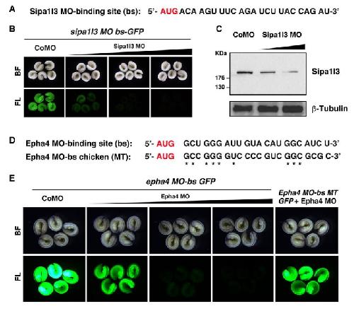A Sequence of the Sipa1l3 MO-binding site (bs). Red letters indicate the start codon of sipa1l3. B Injection of 1ng sipa1l3 MO-bs GFP together with 10ng Control MO leads to GFP translation. Co-injection of 1ng sipa1l3 MO-bs GFP with 0.1ng, 0.5ng as well as 1ng Sipa1l3 MO blocks GFP translation in a dose dependent manner. C Western blot analysis at stage 15 revealed a decrease in endogenous Sipa1l3 protein level upon Sipa1l3 MO injection in a dose dependent manner. 10 and 20ng of Sipa1l3 MO was injected bilaterally in 2-cell stage Xenopus embryos. ï¢-Tubulin was used as loading control. D The sequence of the Epha4 MO-binding site (bs) and Epha4 MO-bs chicken (MT) constructs. Red letters indicate the start codon of epha4. E Epha4 MO efficiently blocks GFP translation in a dose dependent manner. Co-injection of 1ng epha4 MO-bs chicken (MT) GFP with 10ng Epha4 MO however leads to GFP translation. |